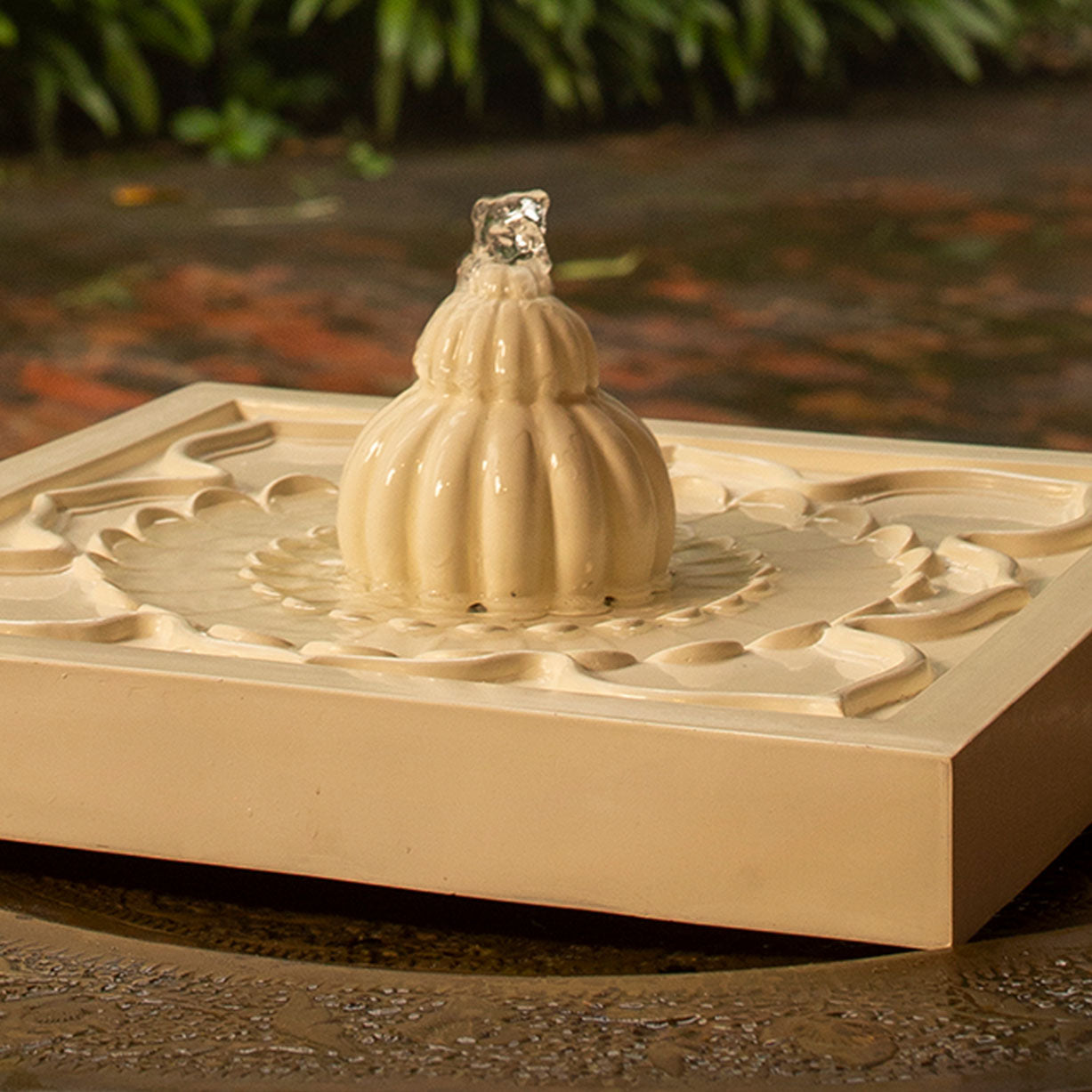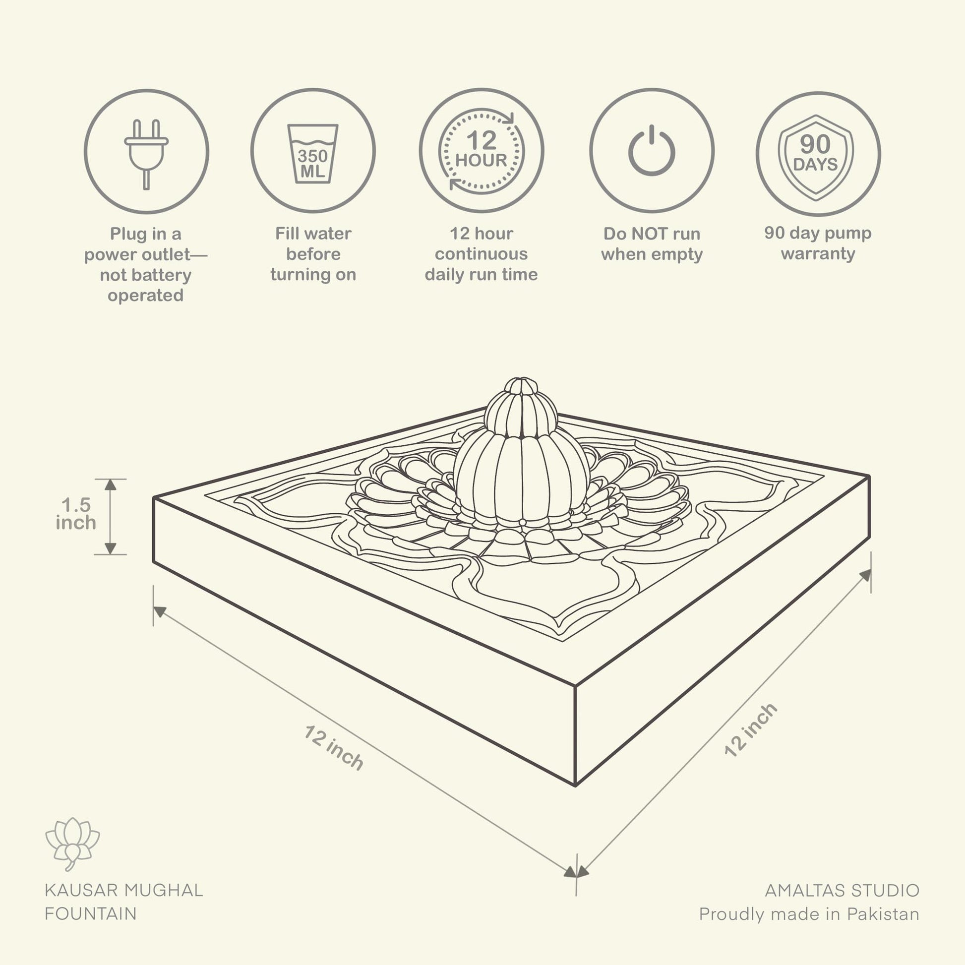 Kausar mughal fountain reimagines tranquility in Mughal design in a modern form. Inspired by hamams and mosaic-lined courtyards of Lahore and Shalimar Bagh. Sculpted by hand, refined through 3D design, and hand casted by skilled kaarigars, it brings a gentle character into still corners.