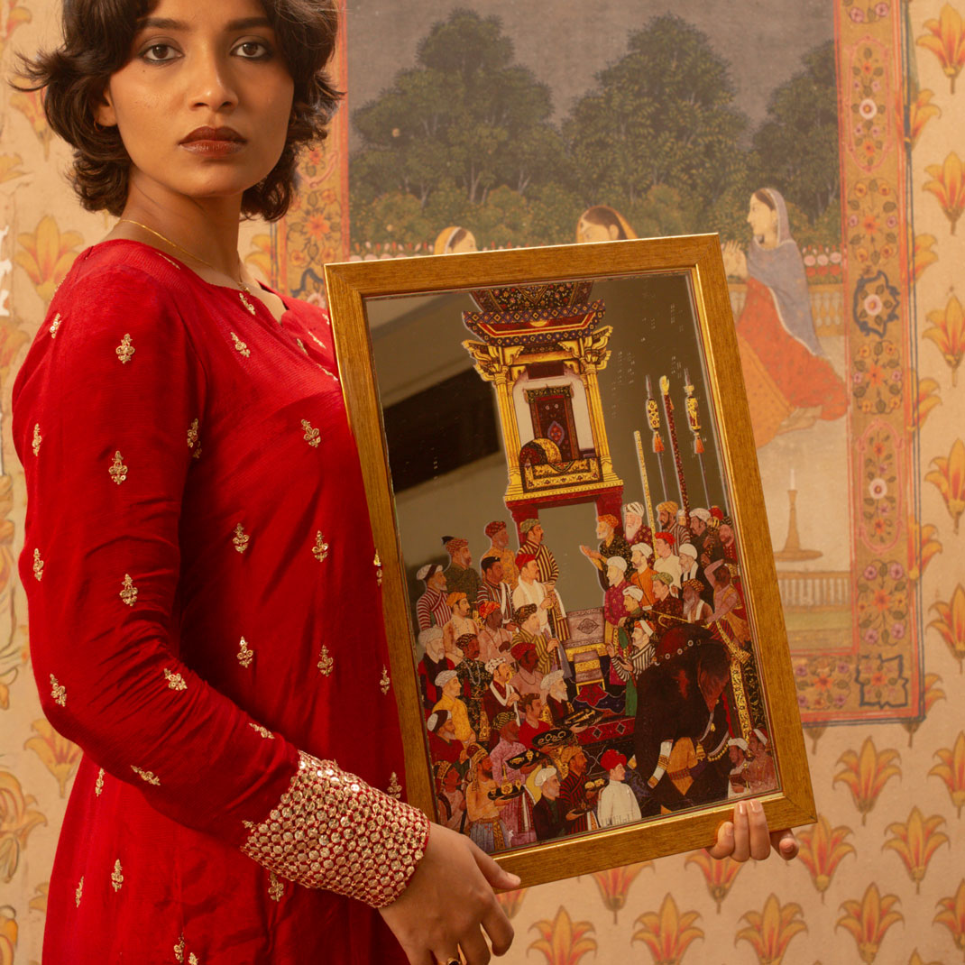A moment of reunion and triumph, Khurram portrays Emperor Jahangir receiving Prince Khurram (later Shah Jahan) on his victorious return from the Deccan. Painted circa 1630–1650, this masterpiece now lives on as a statement printed mirror, bringing the grandeur of empire into your space. An heirloom of history, luxury, and timeless artistry.