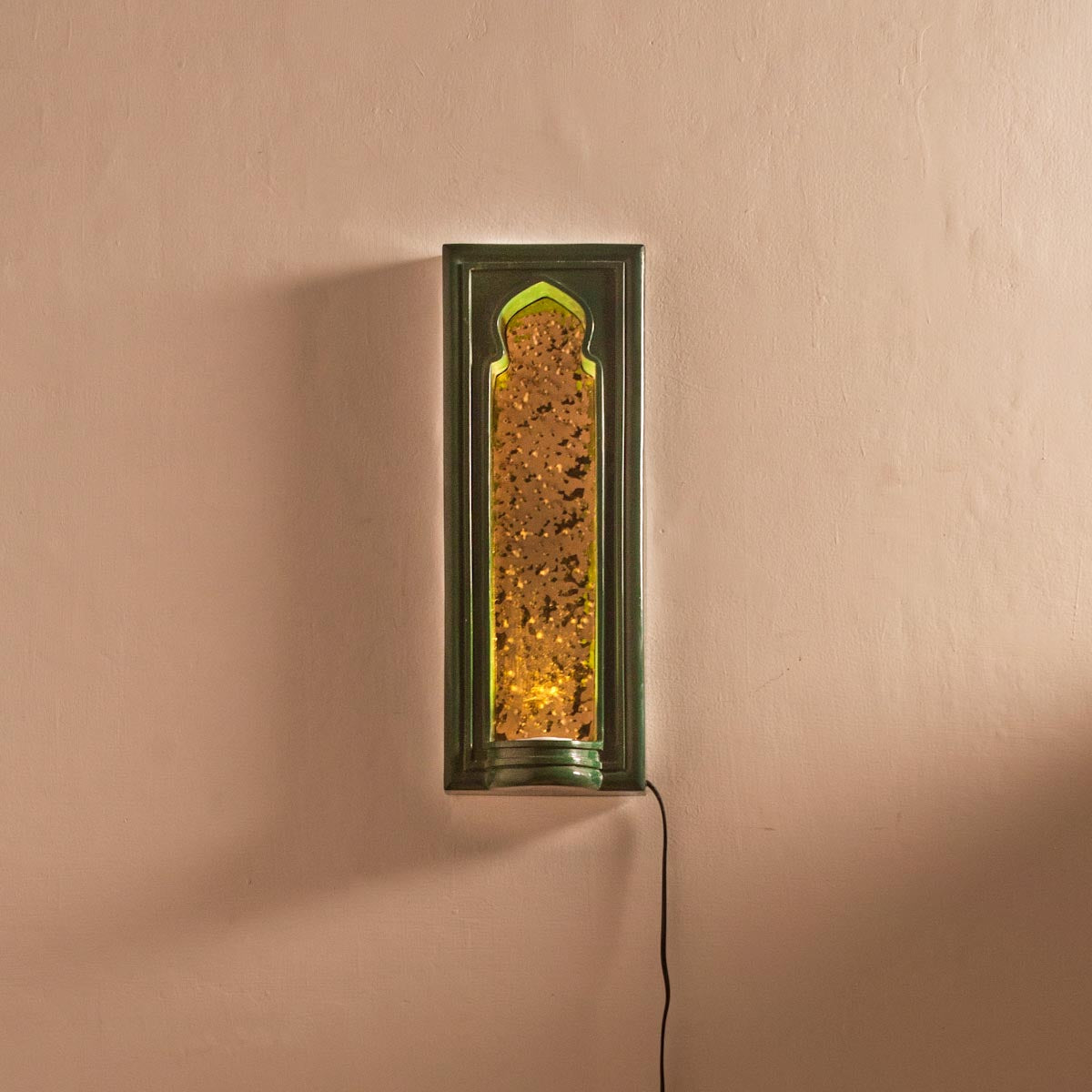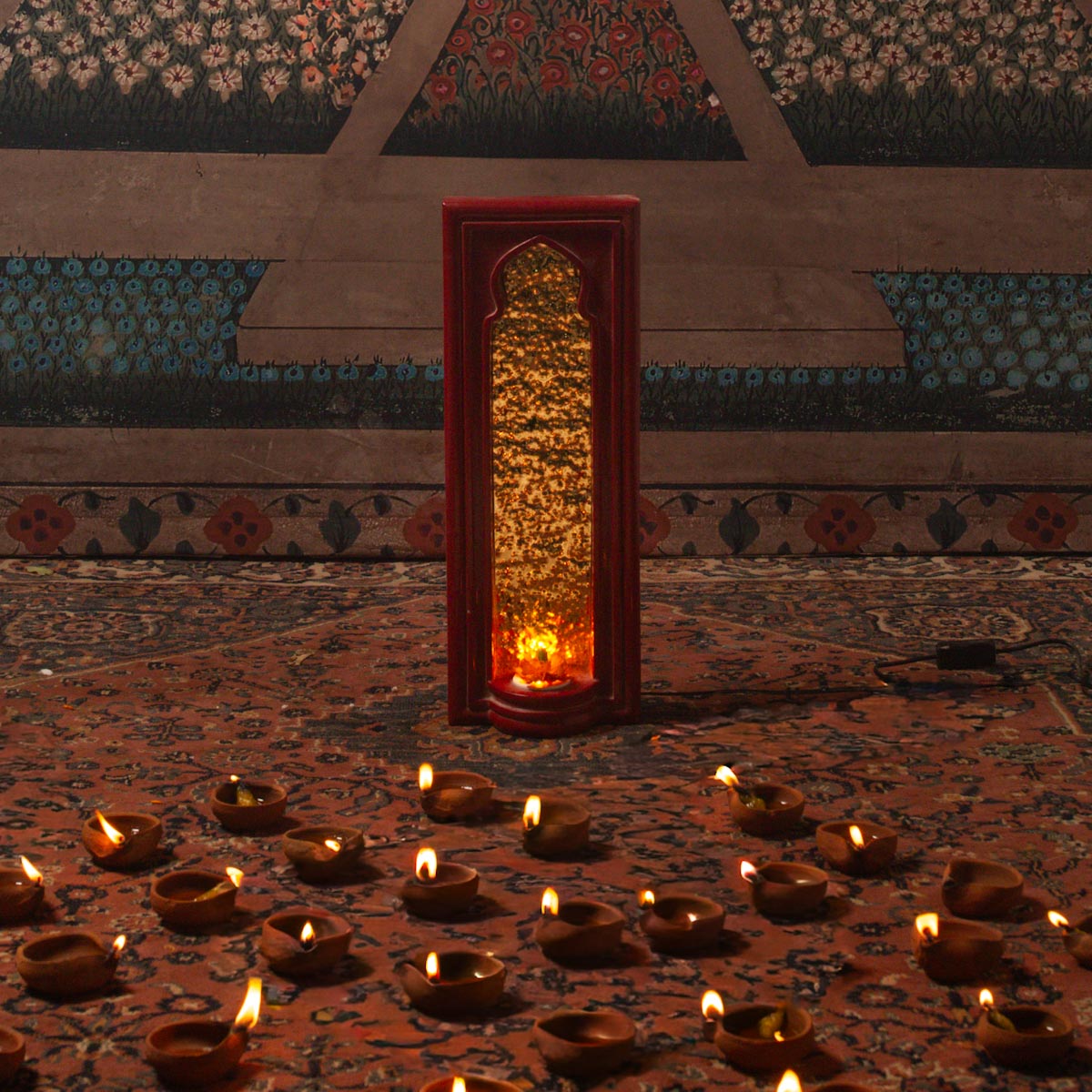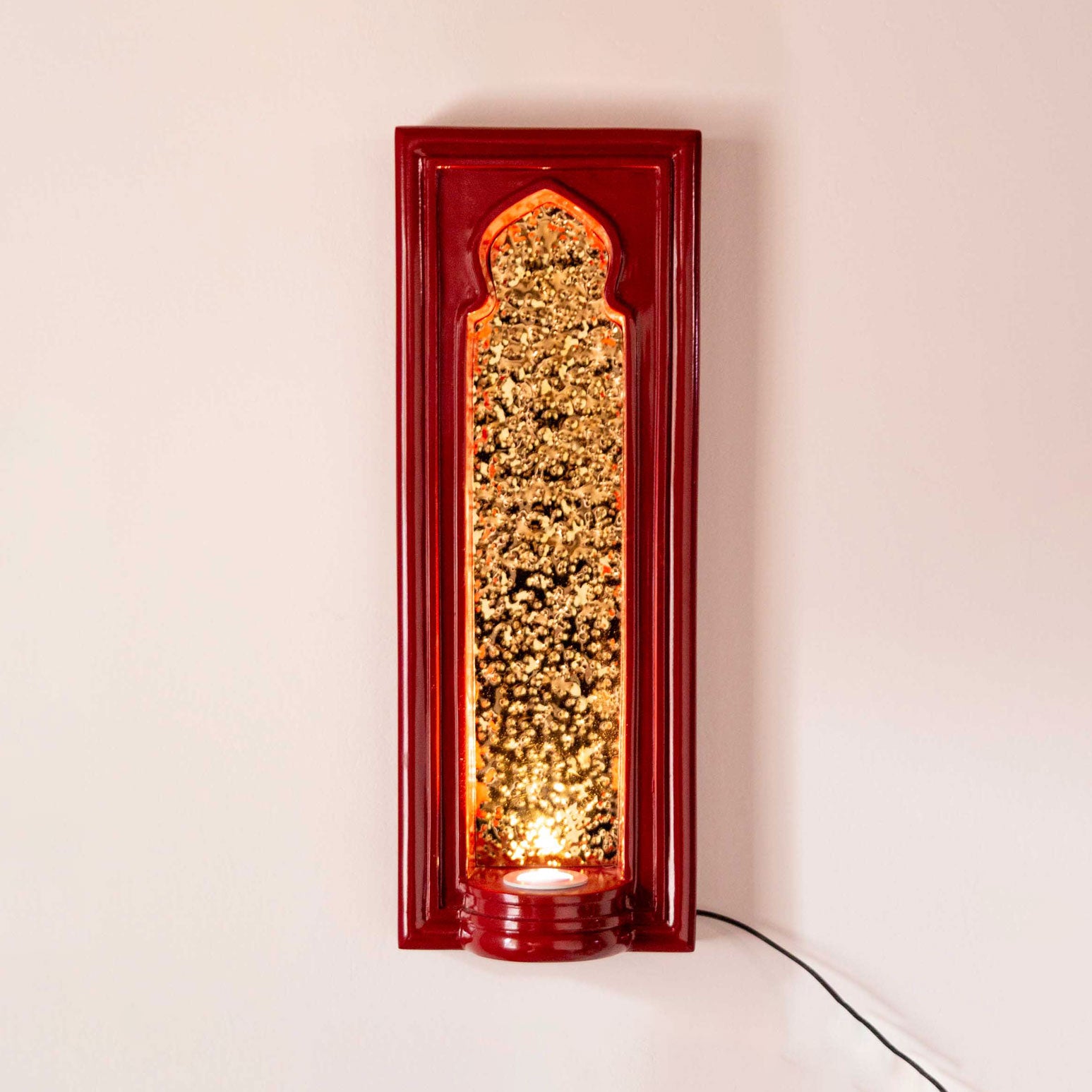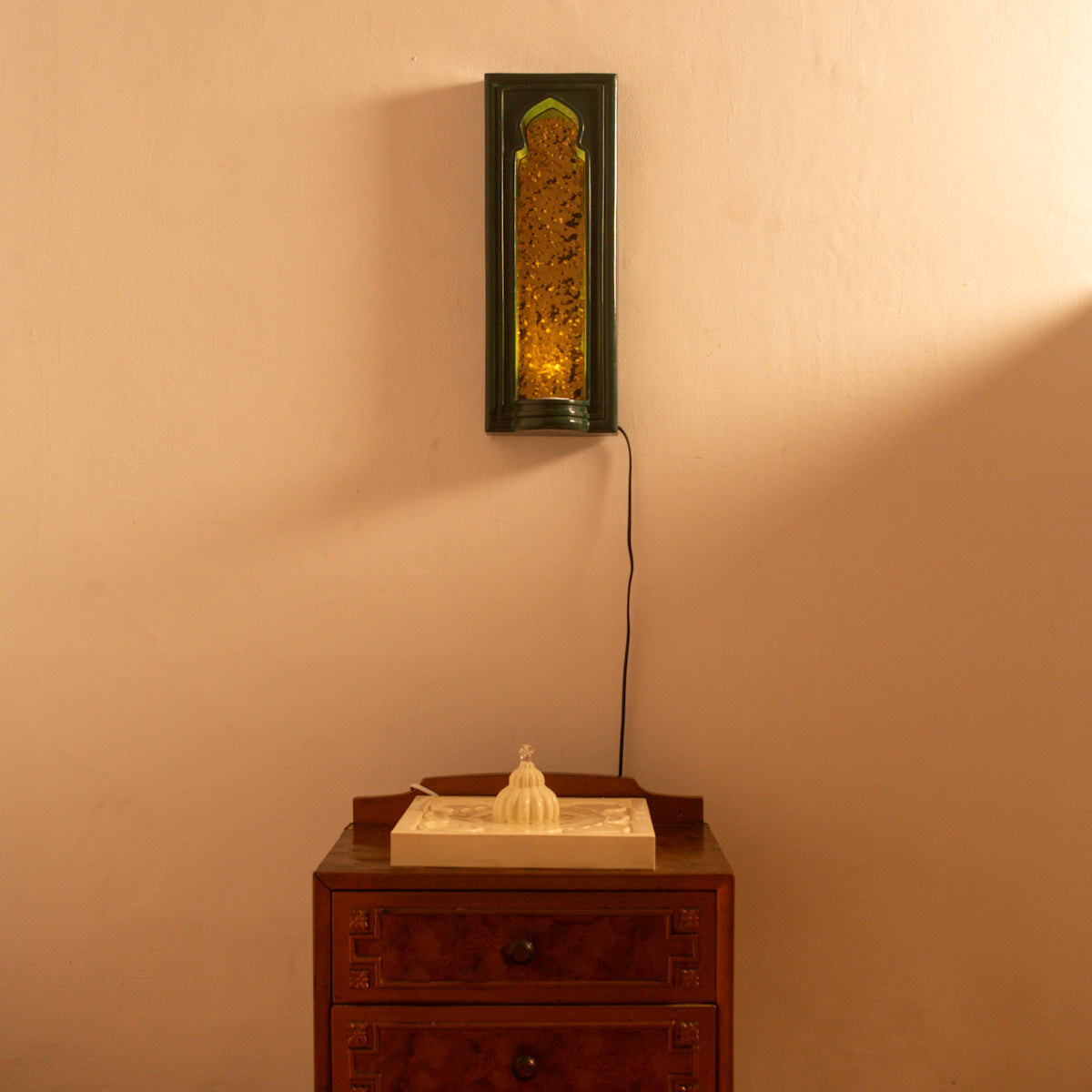 The Sheesh Jharoka wall lamp is inspired by the mirrored ceilings of Sheesh Mahal. The lamp comes alive with tiny glimmers when illuminated.